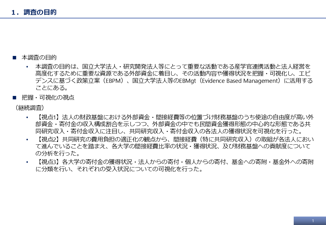 本調査では、エビデンスに基づく大学等運営の一環として、すでに策定されている「産学官連携による共同研究強化のためのガイドライン」(2016 年 11 月 30 日)、「産学官連携による共同研究強化のためのガイドライン(追補版)」(2020年6月30日)(以下、「ガイドライン」という)で示されている資金の好循環の視点のうち、「産学官連携における費用負担の適正化」および「大学・国立研究開発法人の財務基盤の強化」の観点から近年法人にとって重要な収入となっている外部資金や寄付金に着目し、その活動状況を見える化し、マネジメントの改善等に役立ててもらうためのエビデンスを整理することとした。