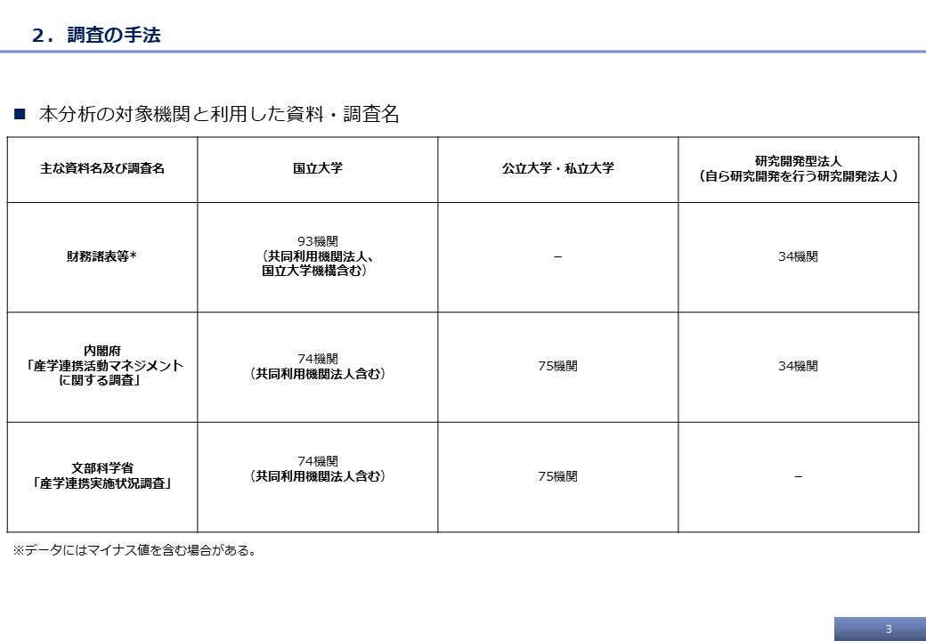 | 主な資料名及び調査名 | 国立大学 | 公立大学・私立大学 | 研究開発型法人 (自ら研究開発を行う研究開発型法人) |