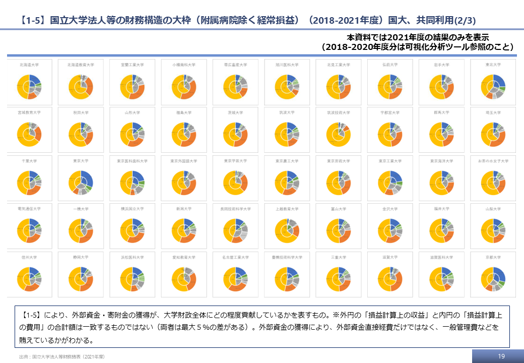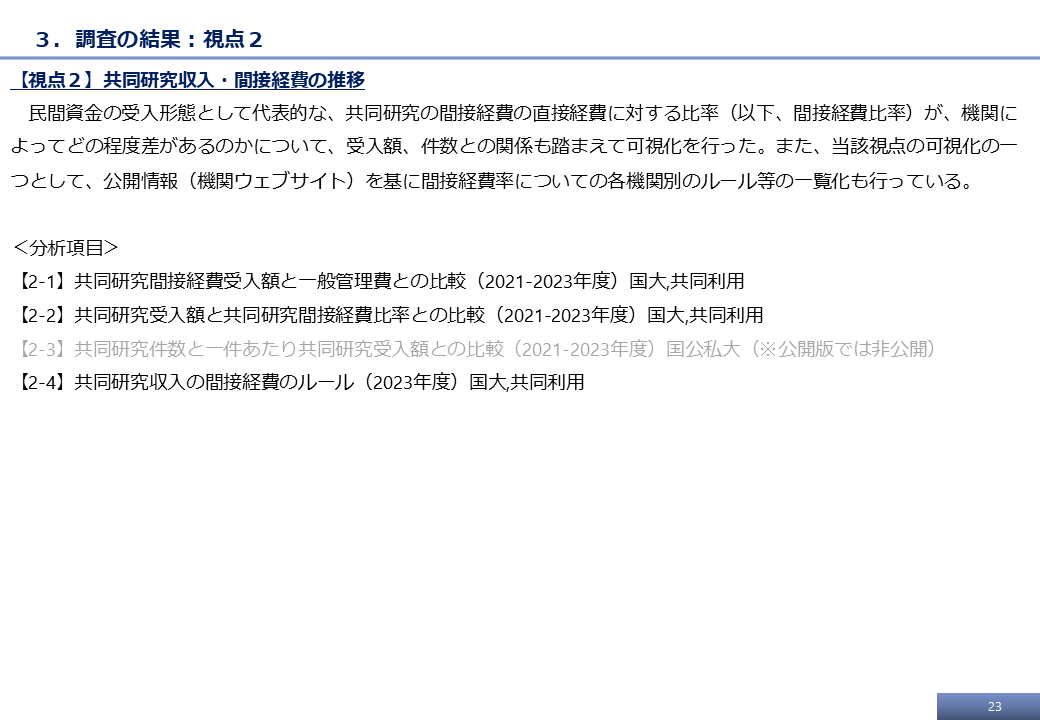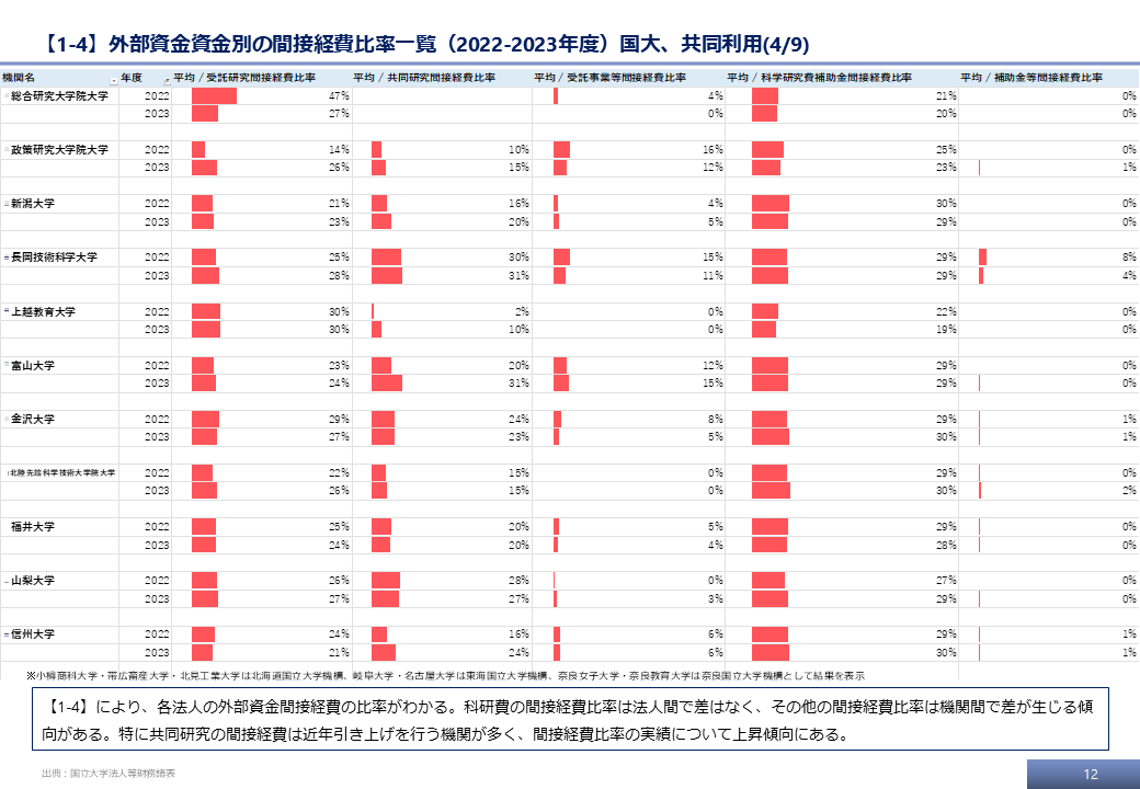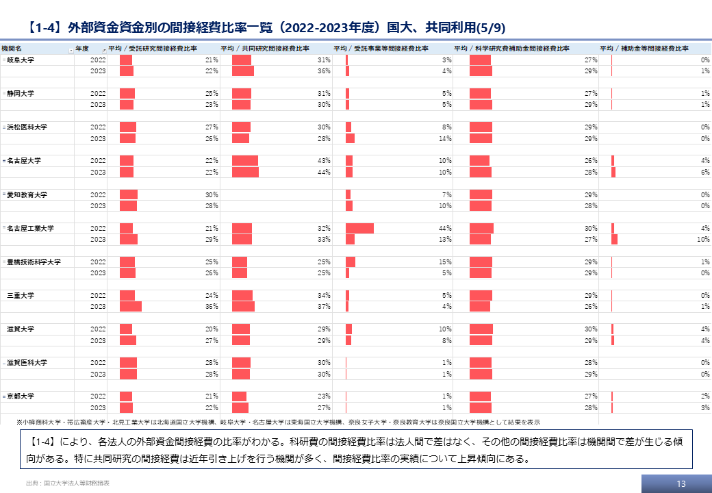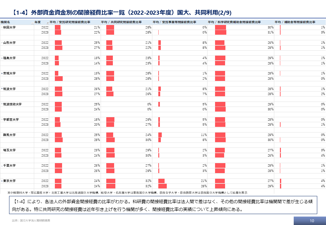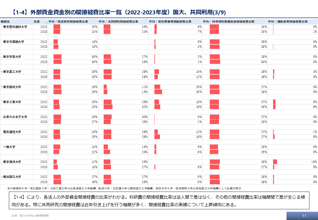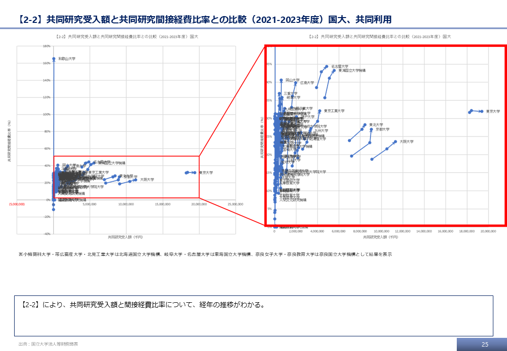 具体的には、法人の財務基盤のうち使途の自由度が高い外部資金・寄付金の収入構成割合を示しつつ、外部資金の中でも伸び率が大きい共同研究収入・寄付金収入に注目し、共同研究収入・寄付金収入の各法人の獲得状況の見える化を行った。また、費用負担の適正化の観点から、間接経費(特に共同研究収入)獲得の取組が各法人において進んでいることを踏まえ、各大学の間接経費比率の状況・獲得状況、及び財務基盤への貢献度についての分析を行った。また、寄付においては、法人からの寄付・個人からの寄付に分類を行い、それぞれの受入状況について分析を行った。令和5年度からは、技術職員の現状に関する基礎データ(性別・雇用形態別・学歴別・世代別)に関する可視化を実施した。