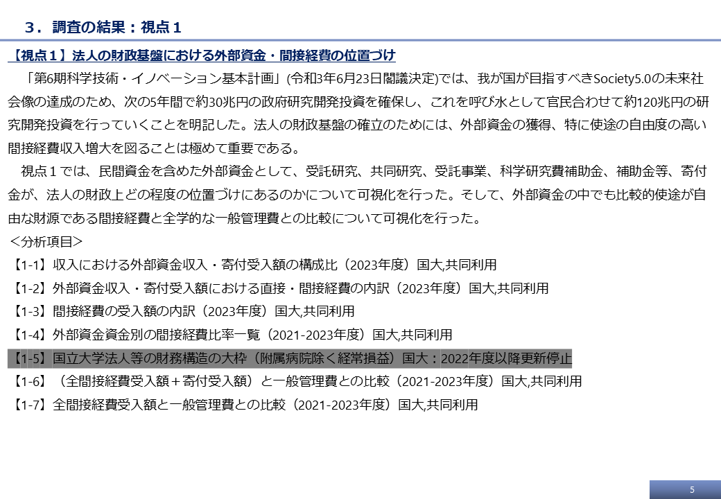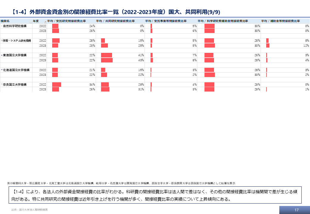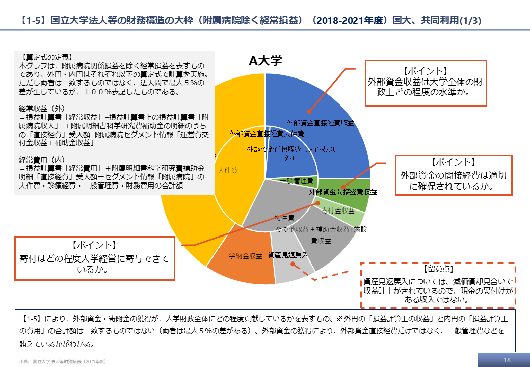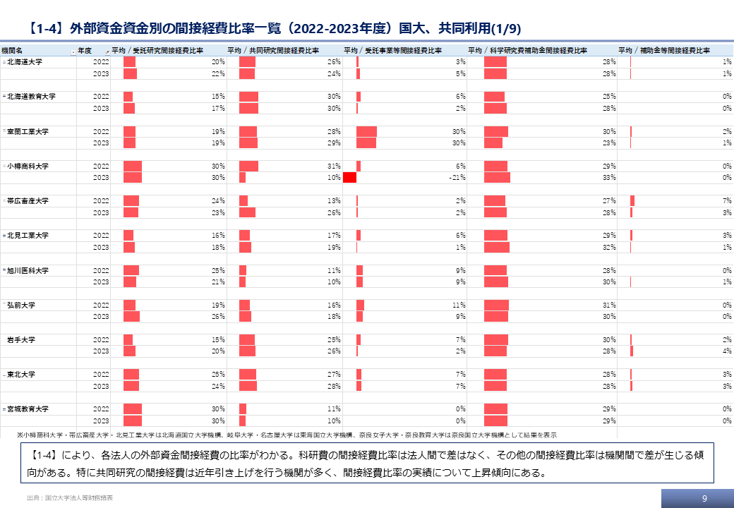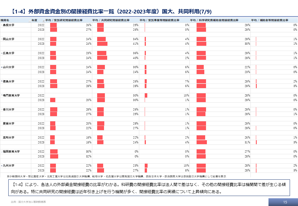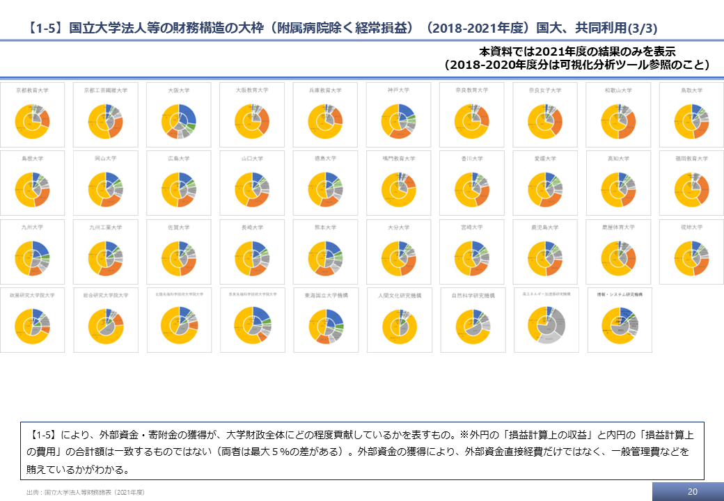 具体的には、法人の財務基盤のうち使途の自由度が高い外部資金・寄付金の収入構成割合を示しつつ、外部資金の中でも伸び率が大きい共同研究収入・寄付金収入に注目し、共同研究収入・寄付金収入の各法人の獲得状況の見える化を行った。また、費用負担の適正化の観点から、間接経費(特に共同研究収入)獲得の取組が各法人において進んでいることを踏まえ、各大学の間接経費比率の状況・獲得状況、及び財務基盤への貢献度についての分析を行った。また、寄付においては、法人からの寄付・個人からの寄付に分類を行い、それぞれの受入状況について分析を行った。令和5年度からは、技術職員の現状に関する基礎データ(性別・雇用形態別・学歴別・世代別)に関する可視化を実施した。