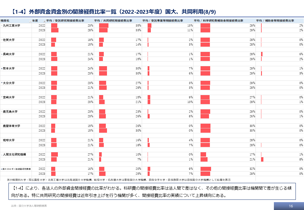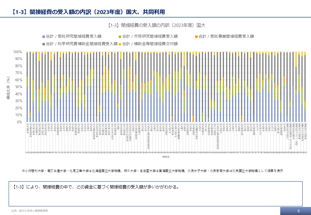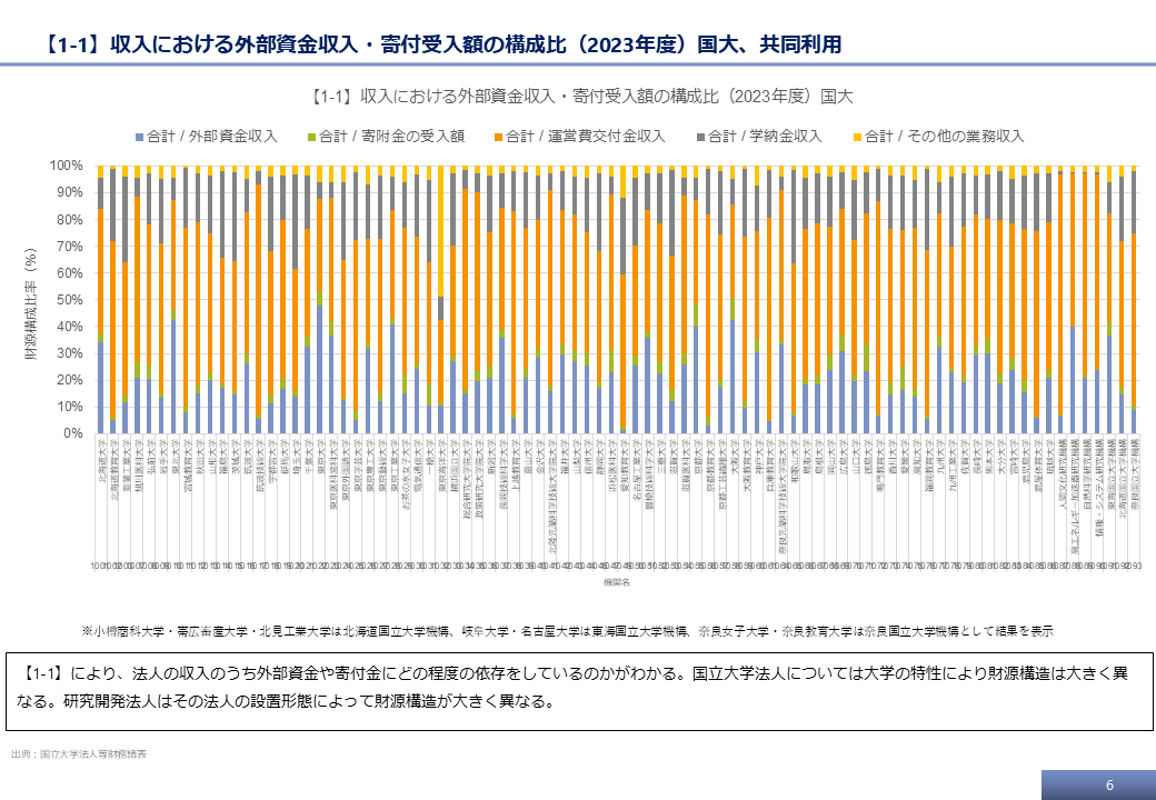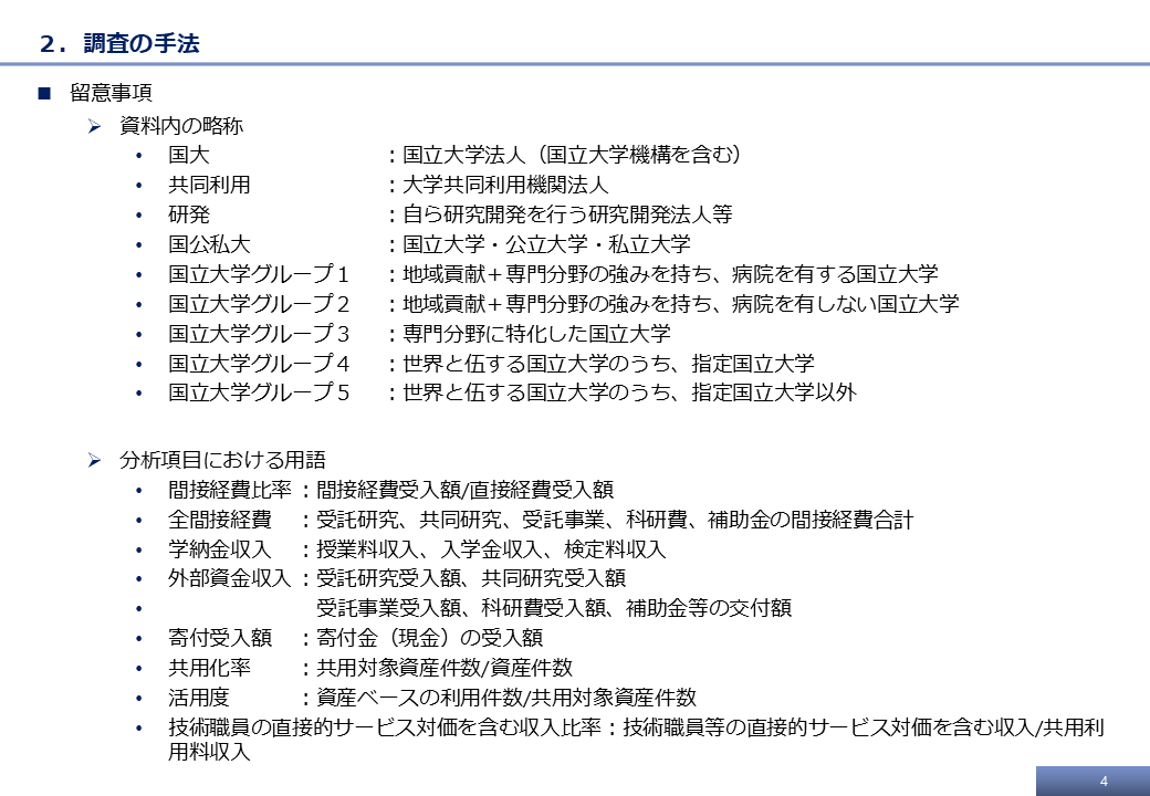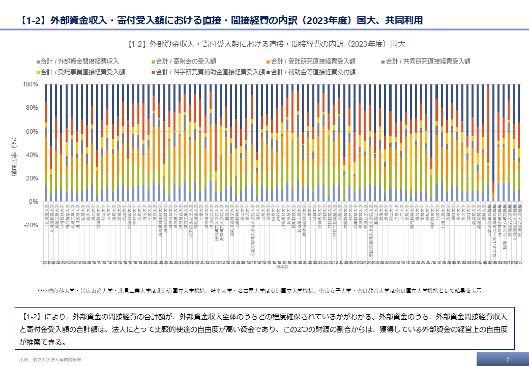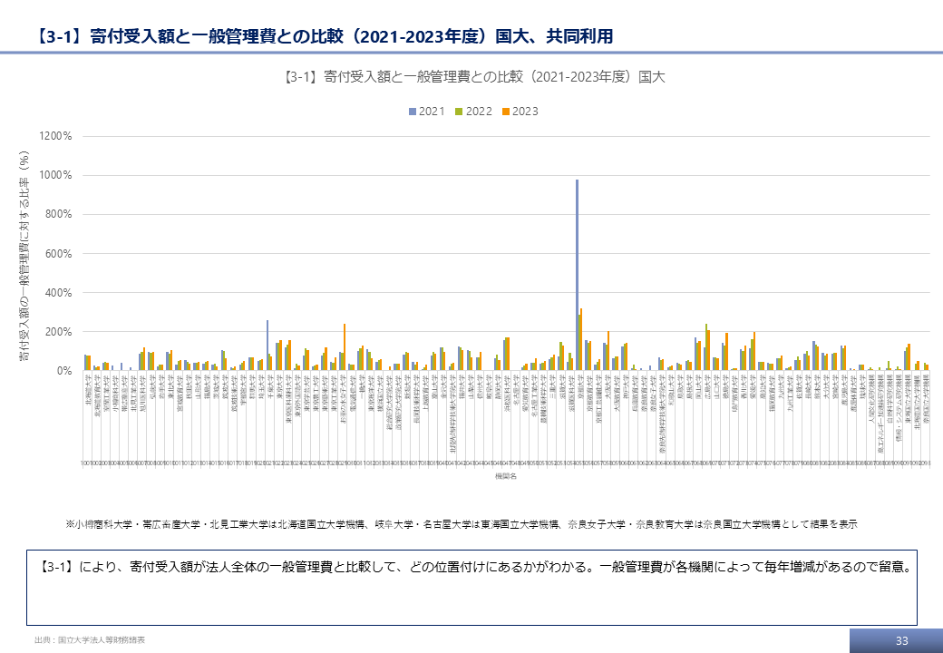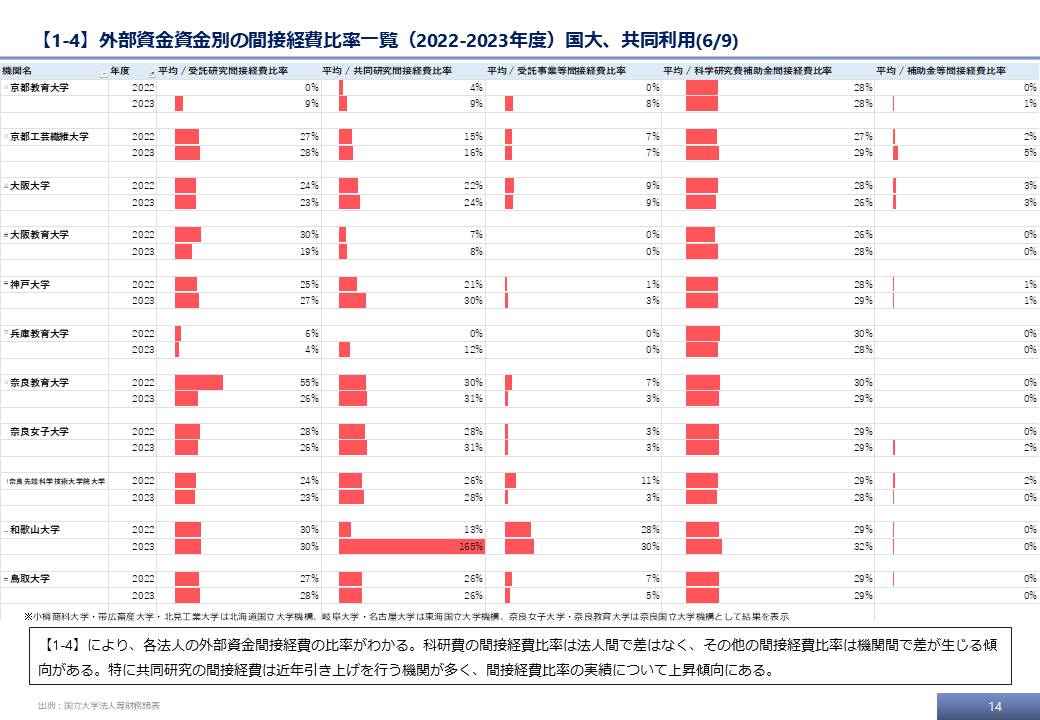 具体的には、法人の財務基盤のうち使途の自由度が高い外部資金・寄付金の収入構成割合を示しつつ、外部資金の中でも伸び率が大きい共同研究収入・寄付金収入に注目し、共同研究収入・寄付金収入の各法人の獲得状況の見える化を行った。また、費用負担の適正化の観点から、間接経費(特に共同研究収入)獲得の取組が各法人において進んでいることを踏まえ、各大学の間接経費比率の状況・獲得状況、及び財務基盤への貢献度についての分析を行った。また、寄付においては、法人からの寄付・個人からの寄付に分類を行い、それぞれの受入状況について分析を行った。令和5年度からは、技術職員の現状に関する基礎データ(性別・雇用形態別・学歴別・世代別)に関する可視化を実施した。