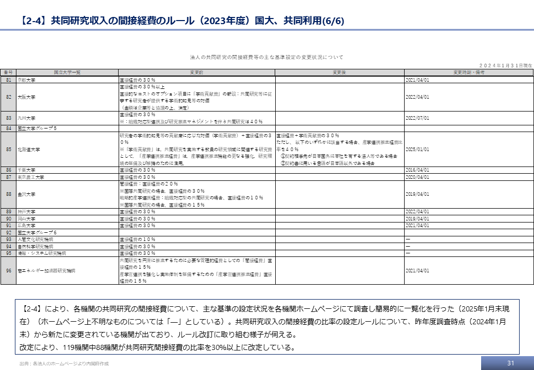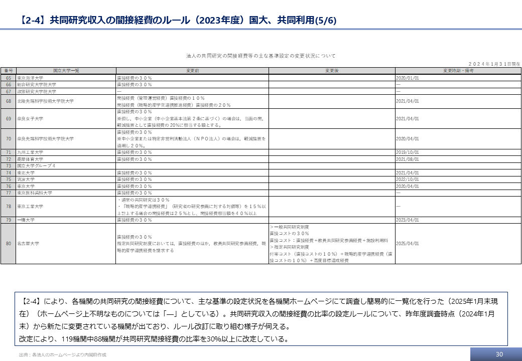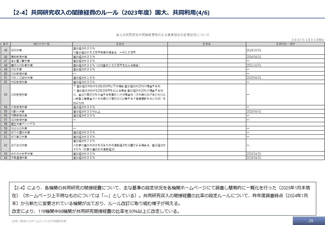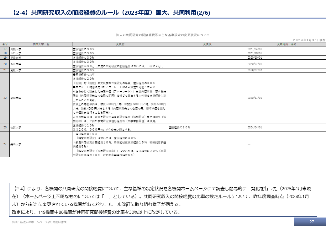「視点 2」 では、共同研究における間接経費の直接経費に対する比率が法人によってどの程度差があるのか、受入額、件数との関係も踏まえて見える化を行った。特に、多くの法人において共同研究の間接経費比率はここ数年で大幅に変更されており、公開情報を基に間接経費の主な基準率や規程等を一覧化した。