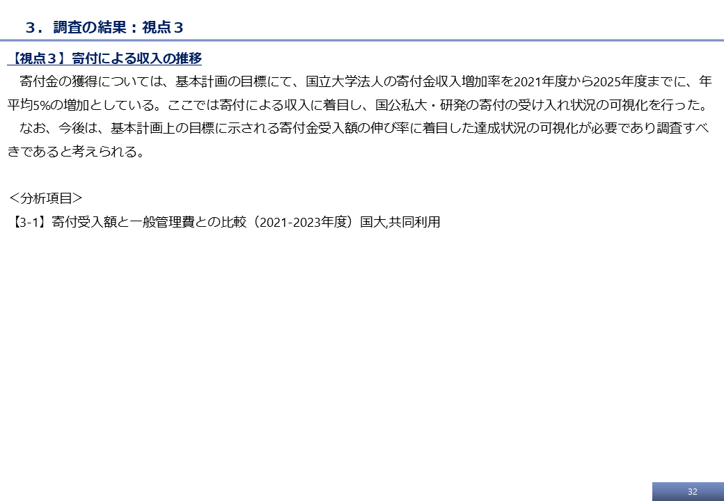 以下に、各視点における分析事例を示しているが、調査結果全体については4.資料から「外部資金・寄付金の獲得状況の分析(2026年2月版)」を参照すること。