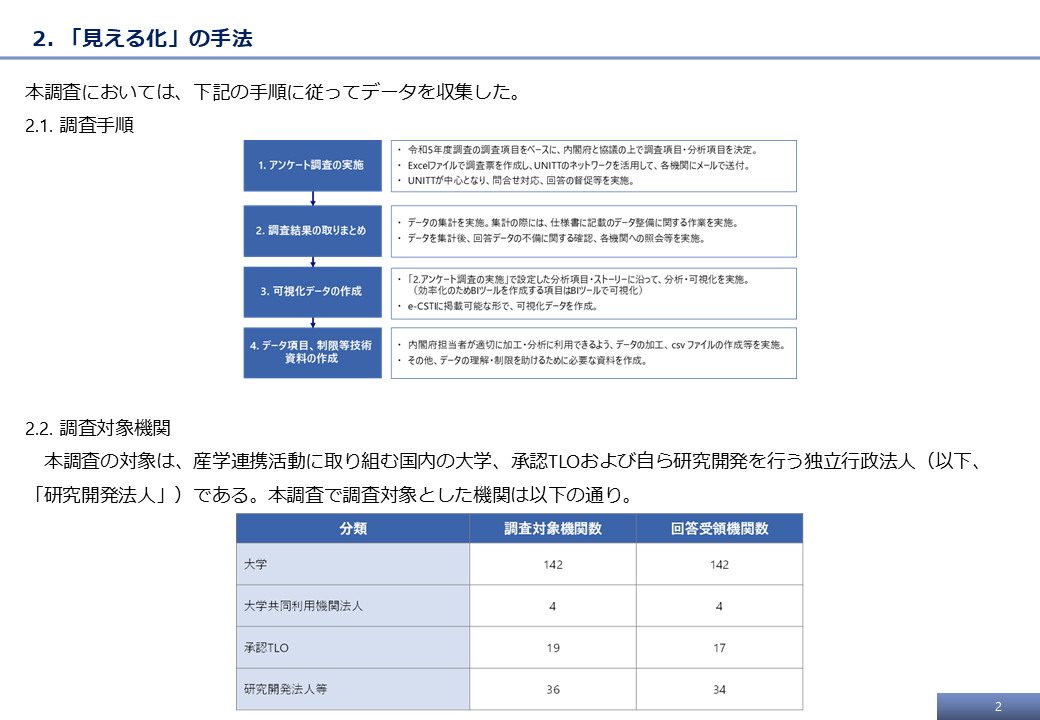 本調査は、内閣府(科学技術・イノベーション担当)から野村総合研究所(NRI)が委託を受け、一部業務を大学技術移転協議会(UNITT)に発注し、実施した。