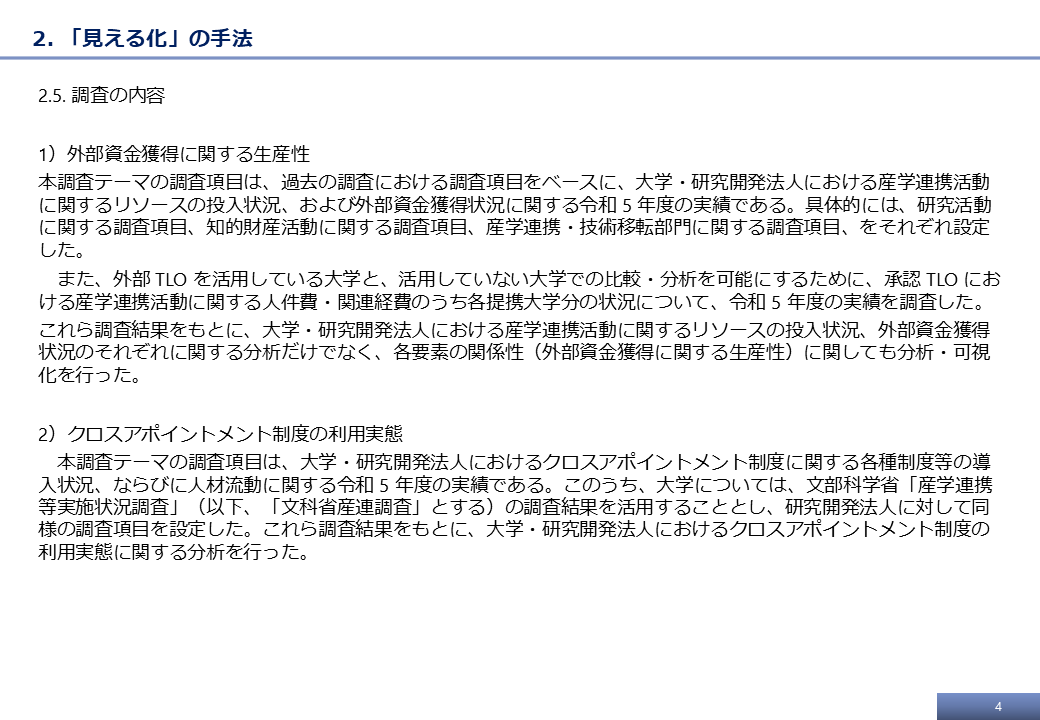 「各機関における産学連携体制へのリソース投入状況と外部資金獲得状況の関係性の見える化を実施する」という目的に照らして、過去の調査における調査項目をベースに、各機関における産学連携活動の状況に係る基礎的な情報を、一定程度まで網羅的に把握できる調査となるように、調査項目を検討した。
