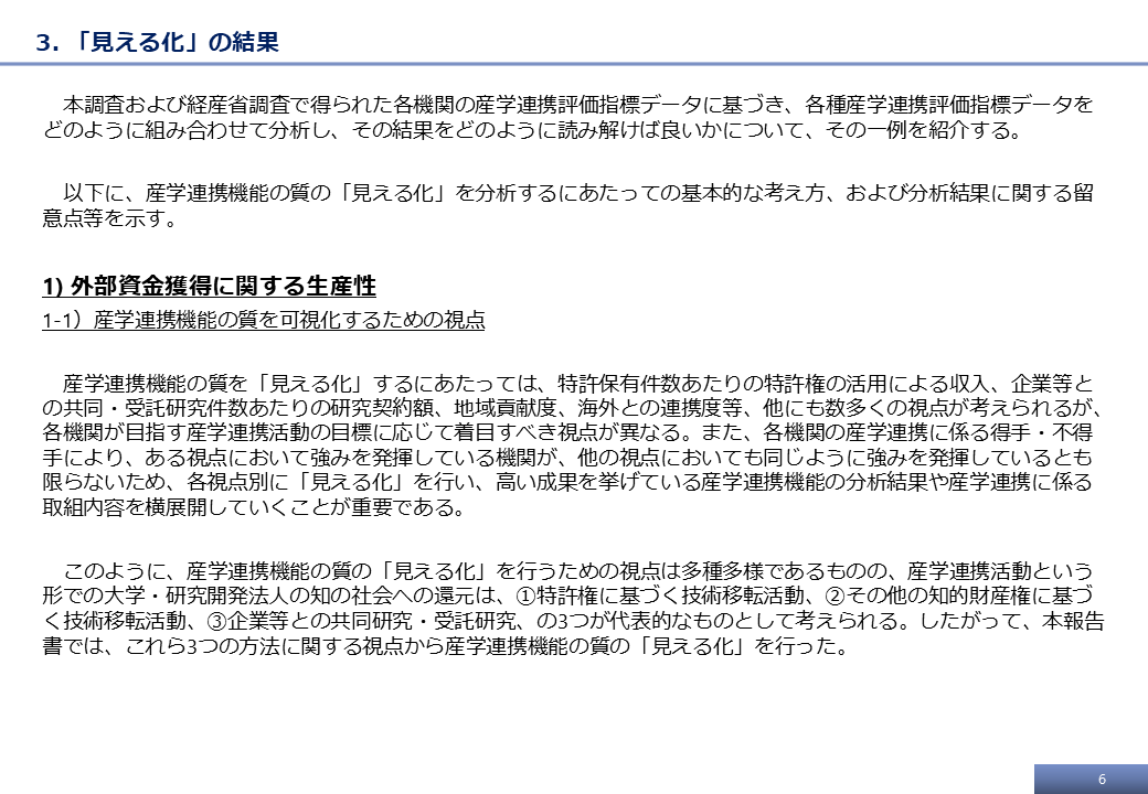 我が国の経済成長の源泉であるイノベーションを継続的に生み出すためには、産学連携機能のパフォーマンスの「質」を評価し、発展途上にある大学等の自主的な活動改善の活性化を促すことが不可欠である。