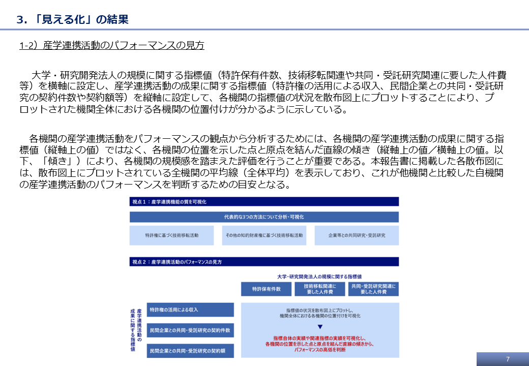 本調査および経産省調査で得られた各機関の産学連携評価指標データに基づき、各種産学連携評価指標データをどのように組み合わせて分析し、その結果をどのように読み解けば良いかについて、以下でその一例を紹介する。