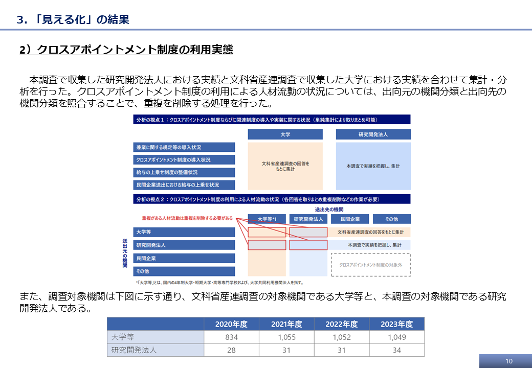 調査項目の検討にあたっては、各機関の回答負荷を可能な限り軽減するべく、一部の調査項目は文科省調査に準拠し、同調査に回答している場合は、省庁間でデータを共有することとした。また、大学や研究開発法人に対して、昨年度調査の回答負荷の高さや新たな調査項目の妥当性に関してヒアリングを行うことで、調査項目のブラッシュアップを実施した。