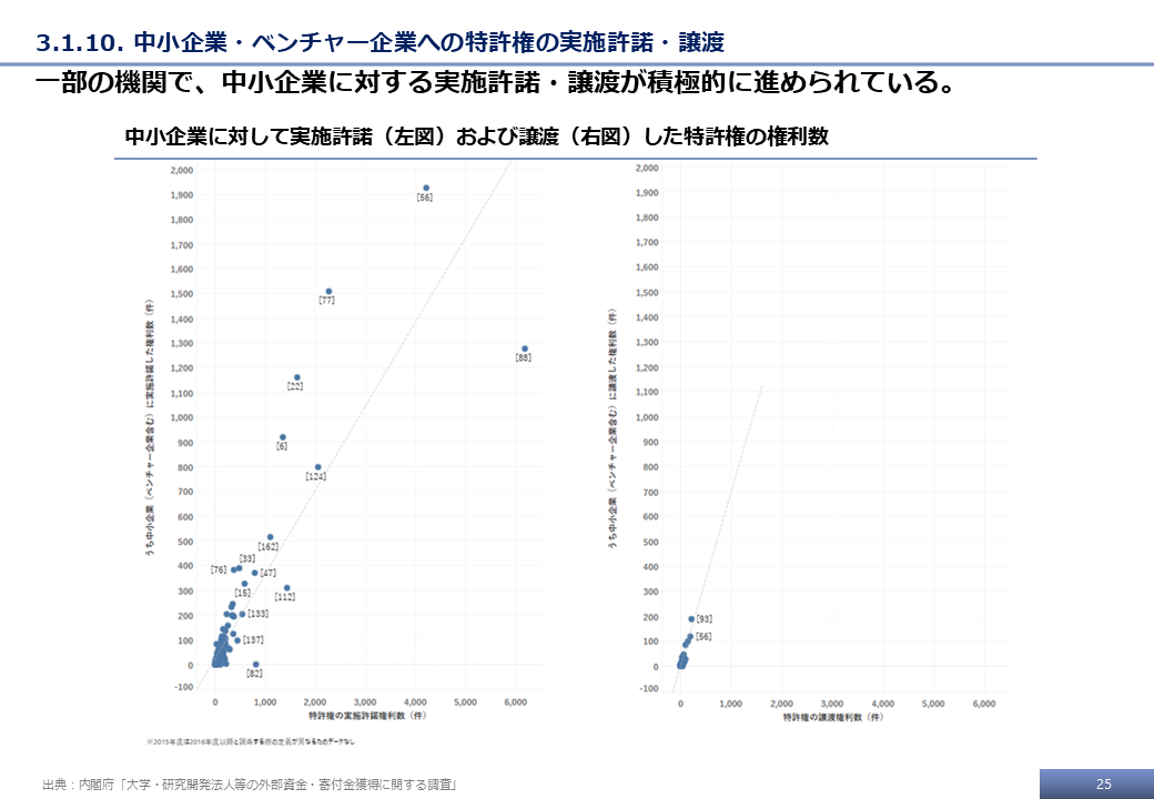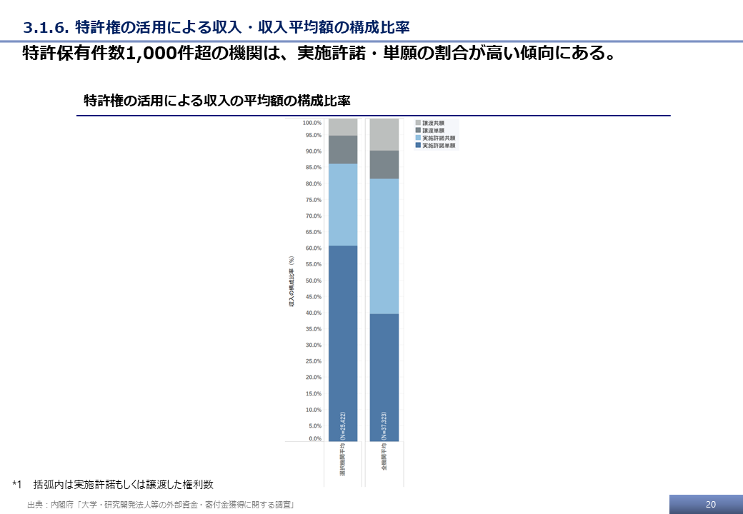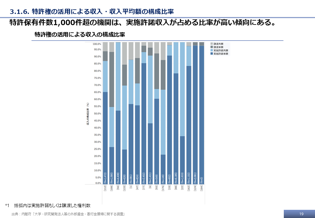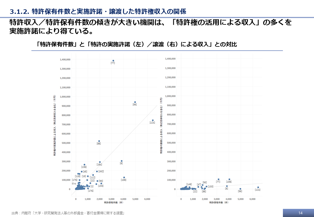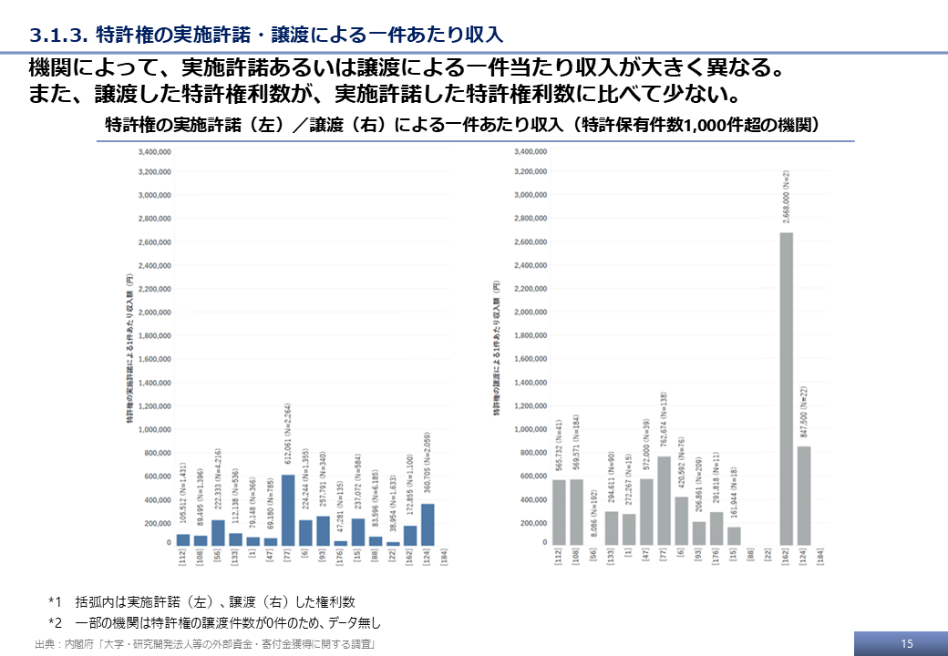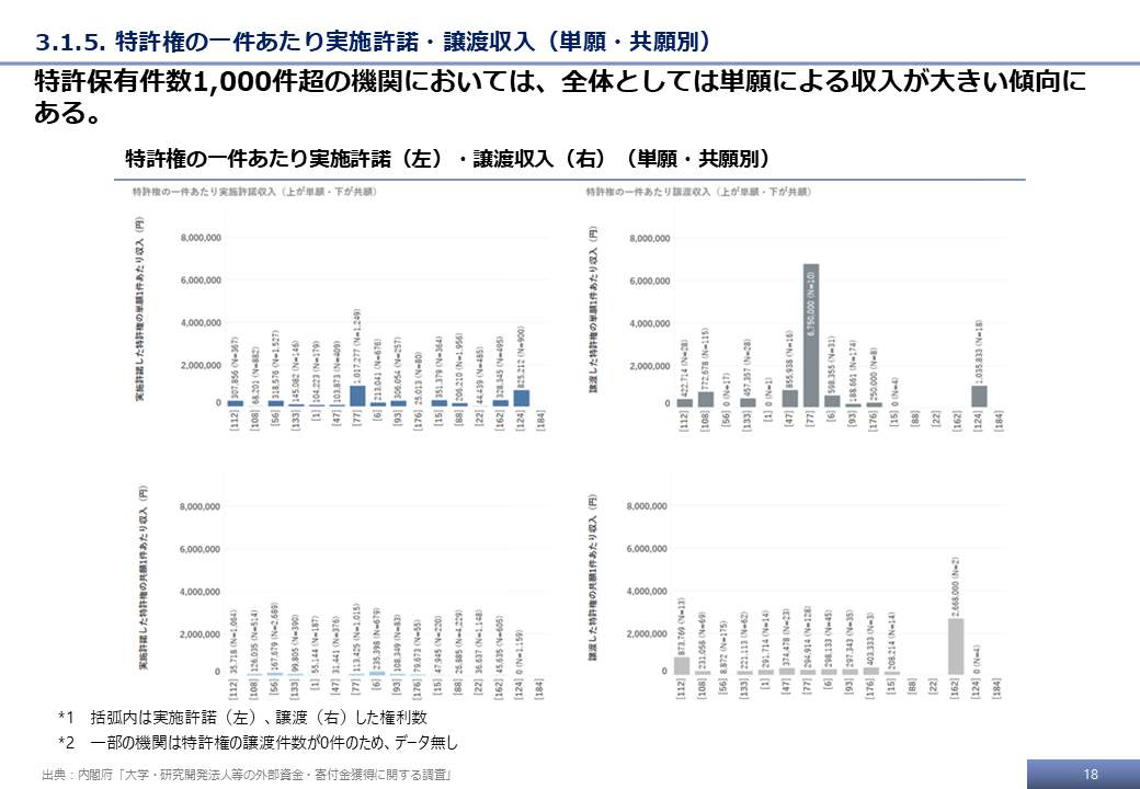 本調査の最終的な受領データ、および文科省調査の結果をもとに、特許権に基づく技術移転活動に関する分析事例を示す。
