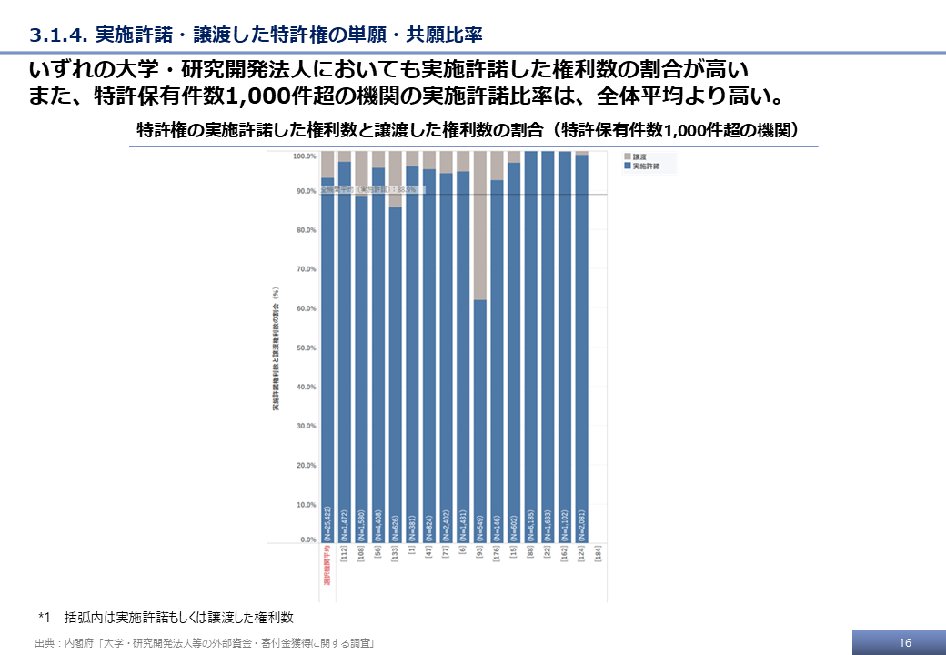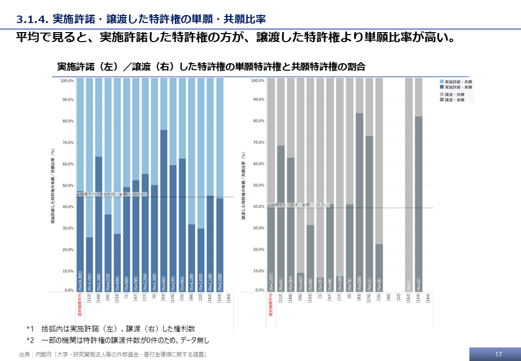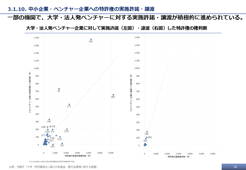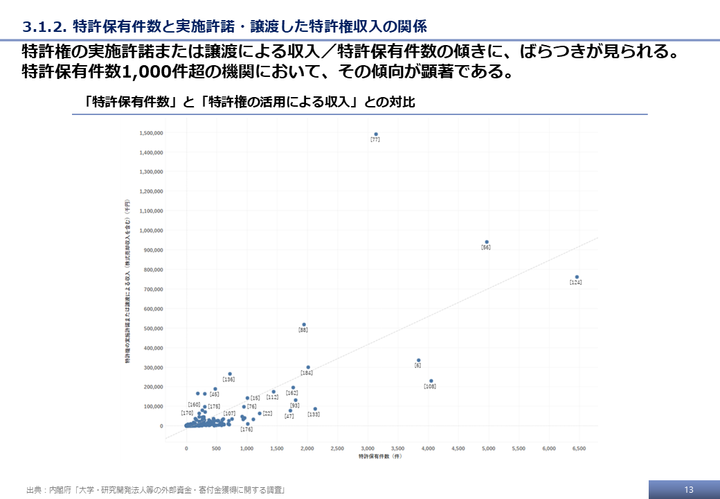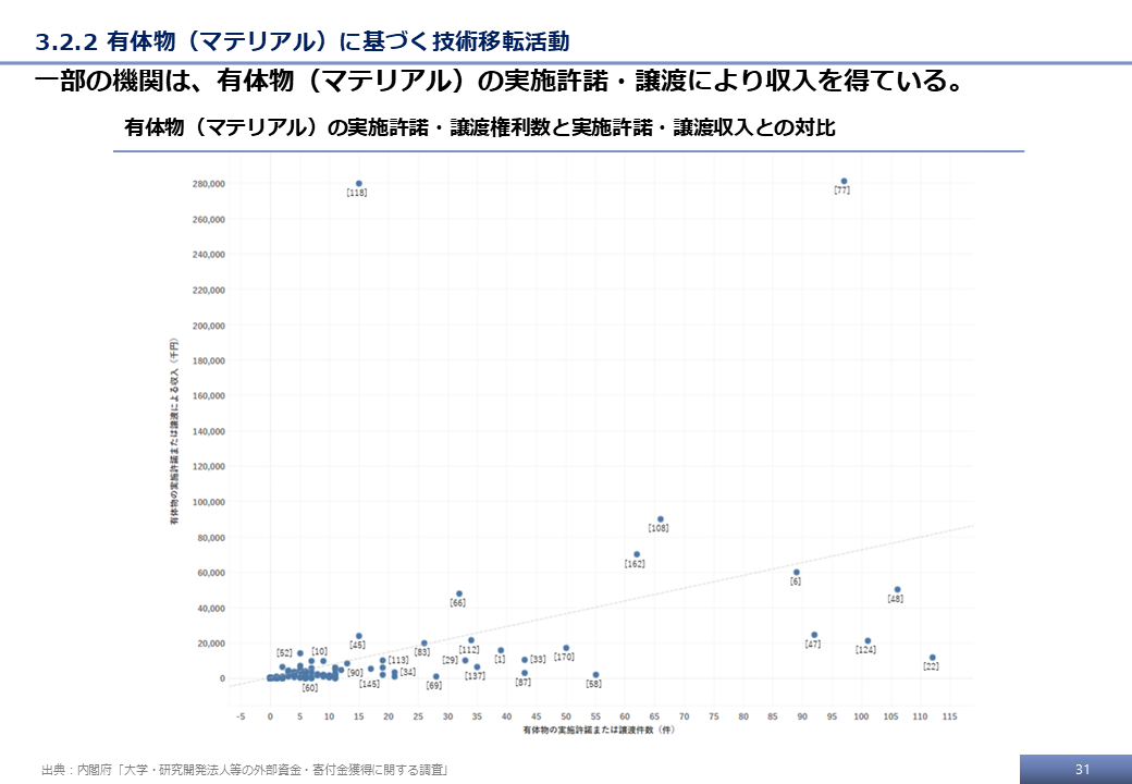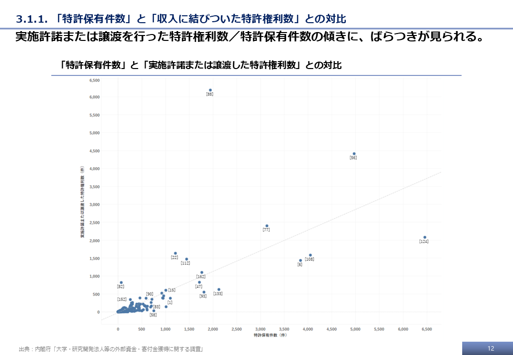 本調査の最終的な受領データ、および文科省調査の結果をもとに、特許権に基づく技術移転活動に関する分析事例を示す。