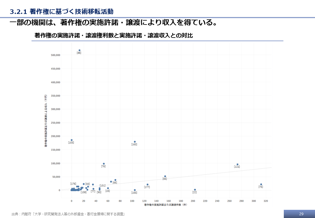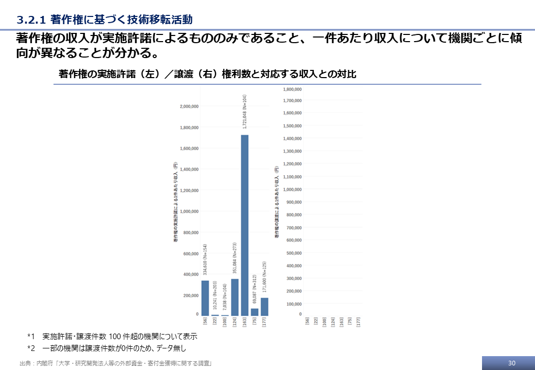 本調査の最終的な受領データ、および文科省調査の結果をもとに、その他の知的財産権、具体的には、著作権および有体物(マテリアル)に基づく技術移転活動に関する分析を行った。ここでは、その一部の分析事例を示す。