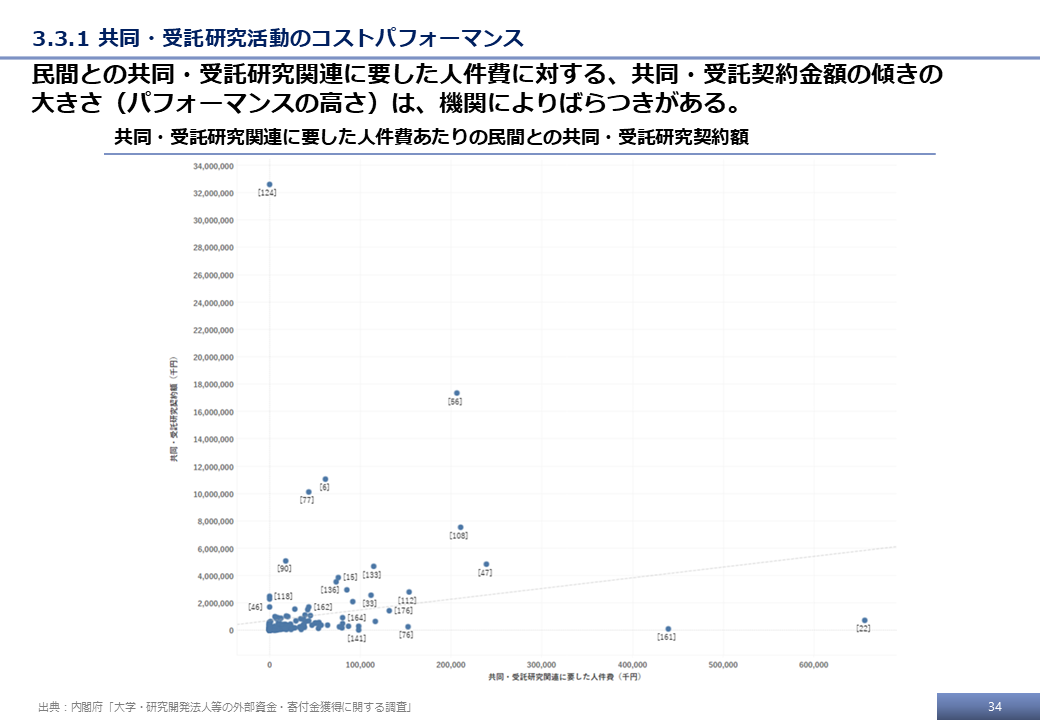 国立大学、研究開発法人等が、法人経営力を高めつつ外部資金の獲得能力を向上していくことを後押しするため、各機関における産学連携体制へのリソース投入状況と外部資金獲得状況の関係性の見える化を実施した。